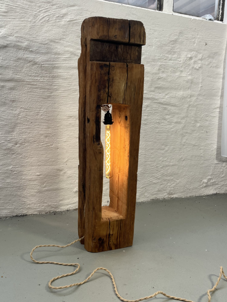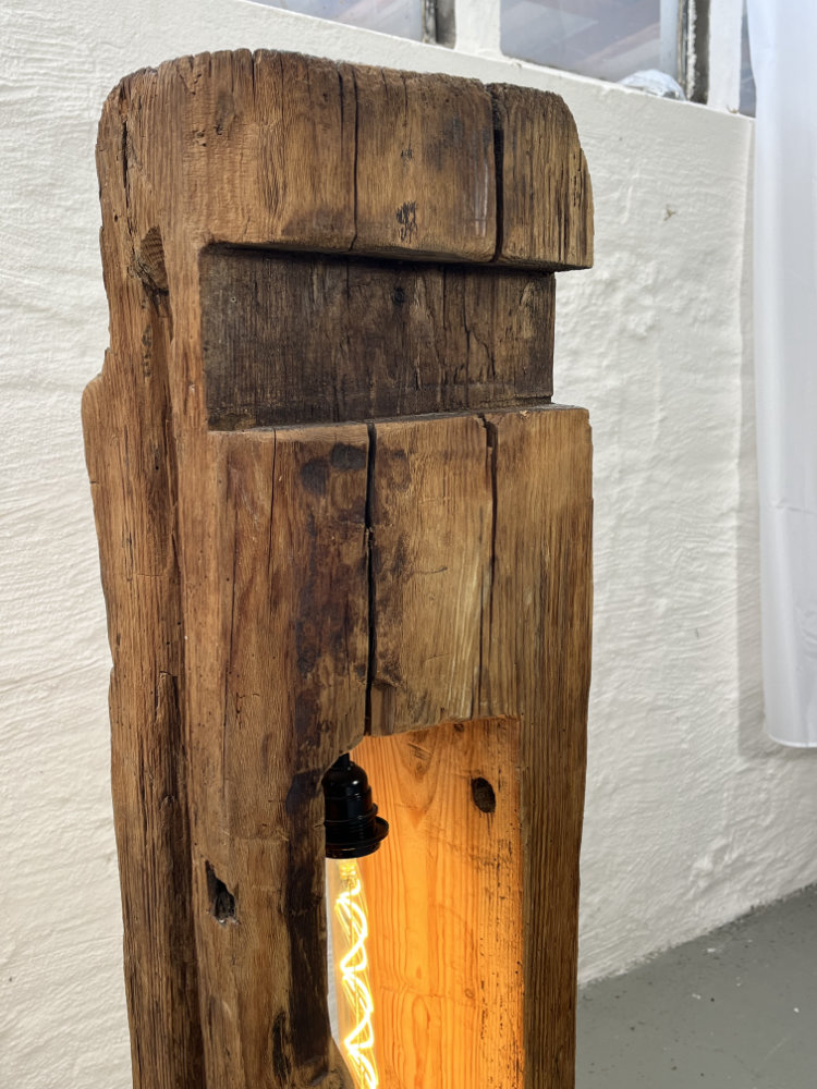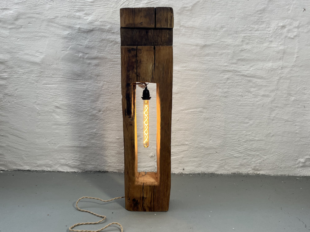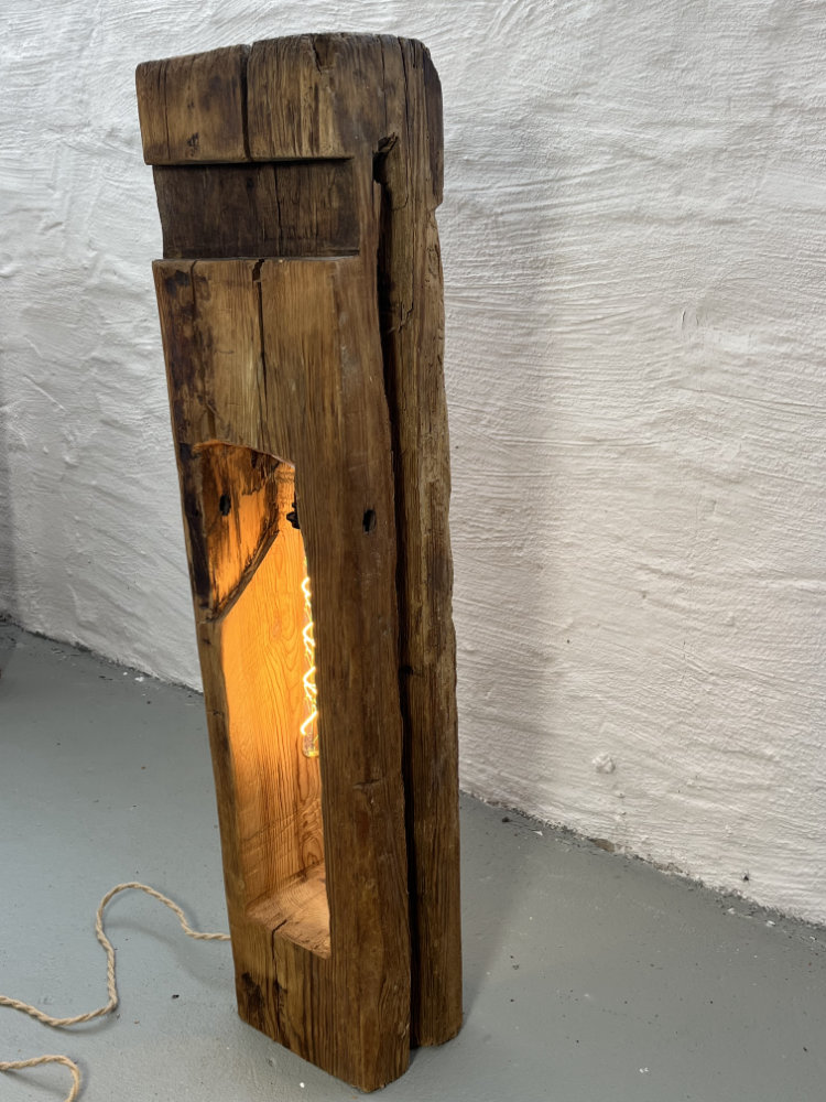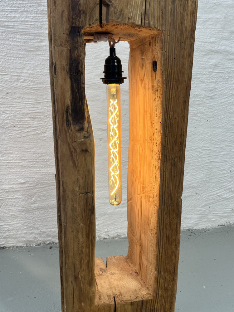 Diese einzigartige Stehleuchte wurde aus einem über 200 Jahre alten Balken der ehemaligen Mosterei in Bad Belzig gefertigt. Jeder Balken trägt sichtbare Spuren der Zeit – Risse, Zapfenlöcher, handwerkliche Einkerbungen – und macht jede Leuchte zu einem unverwechselbaren Unikat der Flämingrebellen.