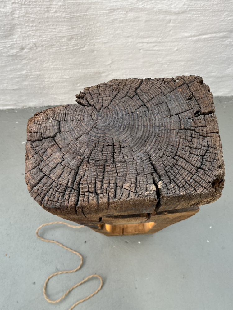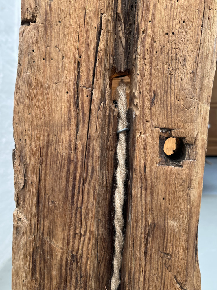 Der historische Balken wurde behutsam aufgearbeitet und mit Bienenwachs behandelt, ohne seinen ursprünglichen Charakter zu verlieren. Die warme Maserung, die dunklen Gebrauchsspuren und die markanten alten Holzverbindungen verleihen der Leuchte ihre besondere Ausstrahlung.