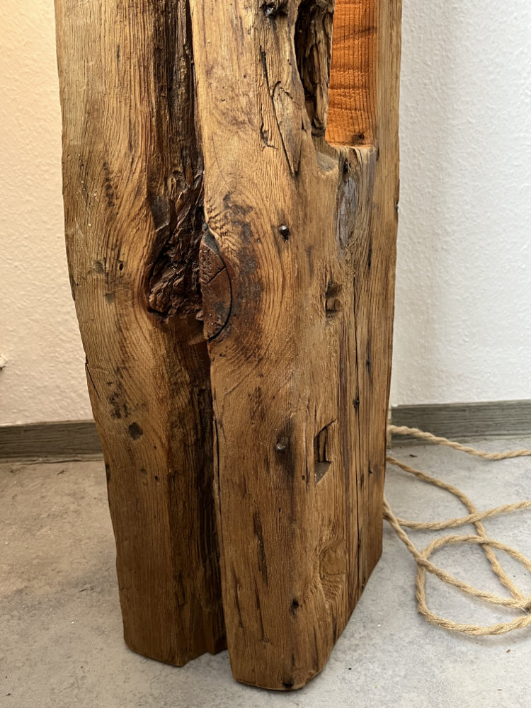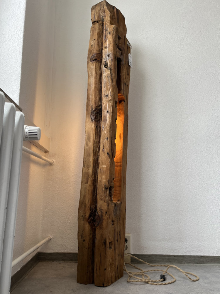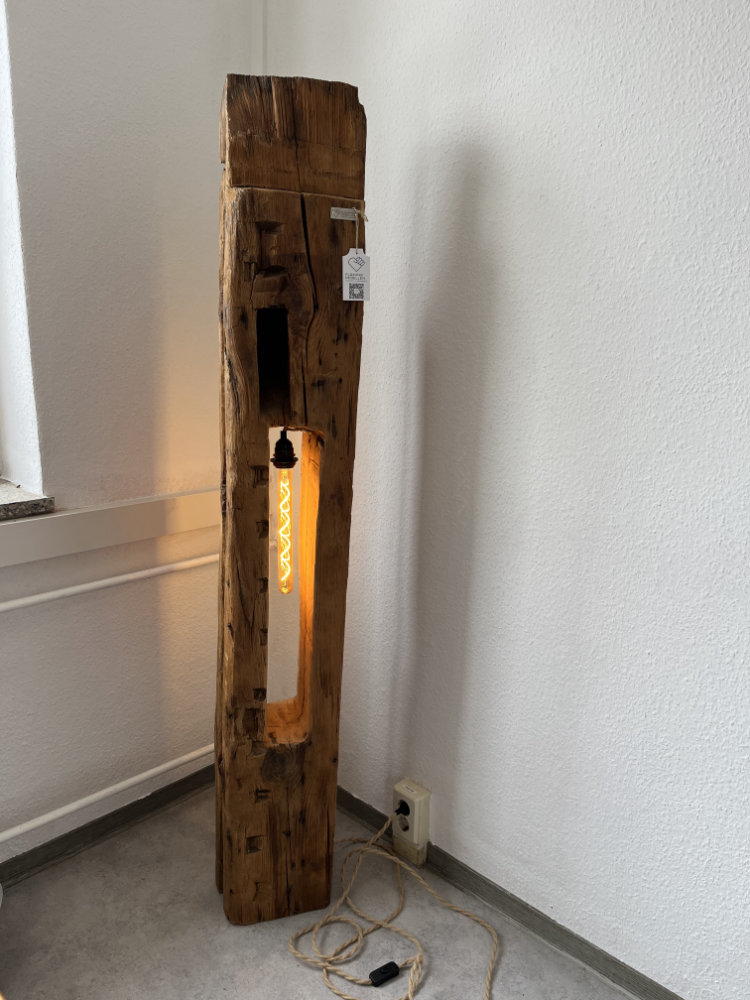 Diese einzigartige Stehleuchte wurde aus einem über 200 Jahre alten Deckenbalken der ehemaligen Mosterei in Bad Belzig gefertigt. Jeder Balken trägt sichtbare Spuren der Zeit – Risse, Zapfenlöcher, handwerkliche Einkerbungen – und macht jede Leuchte zu einem unverwechselbaren Unikat der Flämingrebellen.