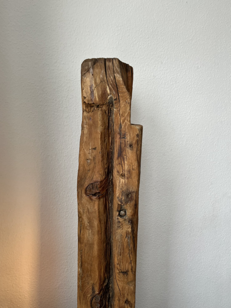 Der historische Balken wurde behutsam aufgearbeitet und mit Bienenwachs behandelt, ohne seinen ursprünglichen Charakter zu verlieren. Die warme Maserung, die dunklen Gebrauchsspuren und die markanten alten Holzverbindungen verleihen der Leuchte ihre besondere Ausstrahlung.