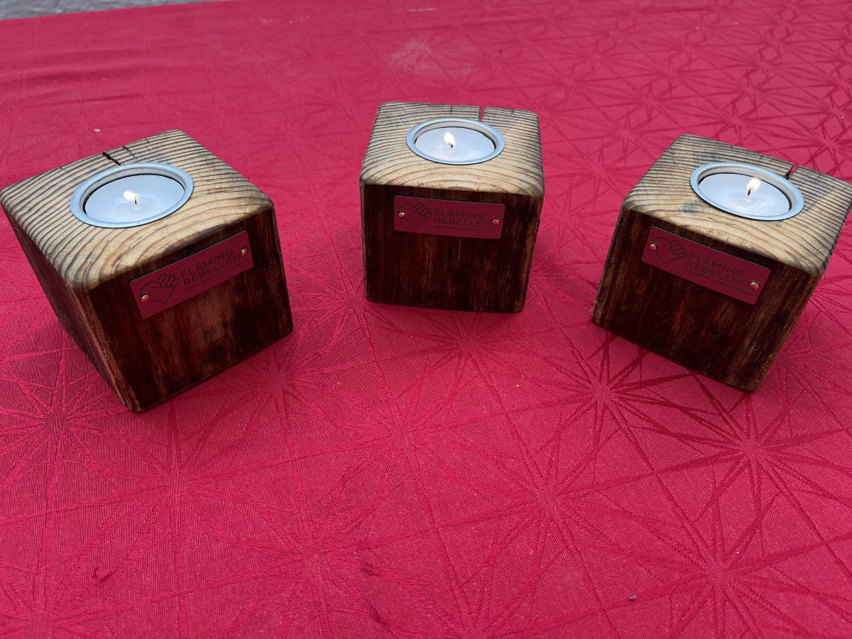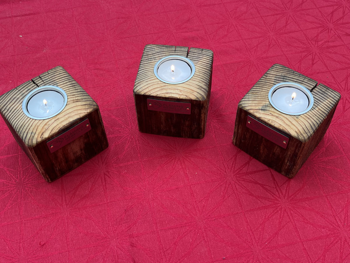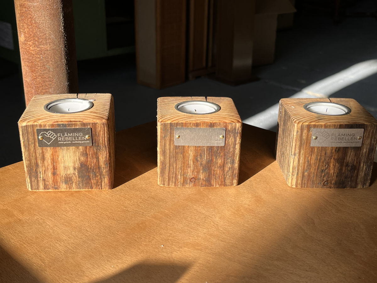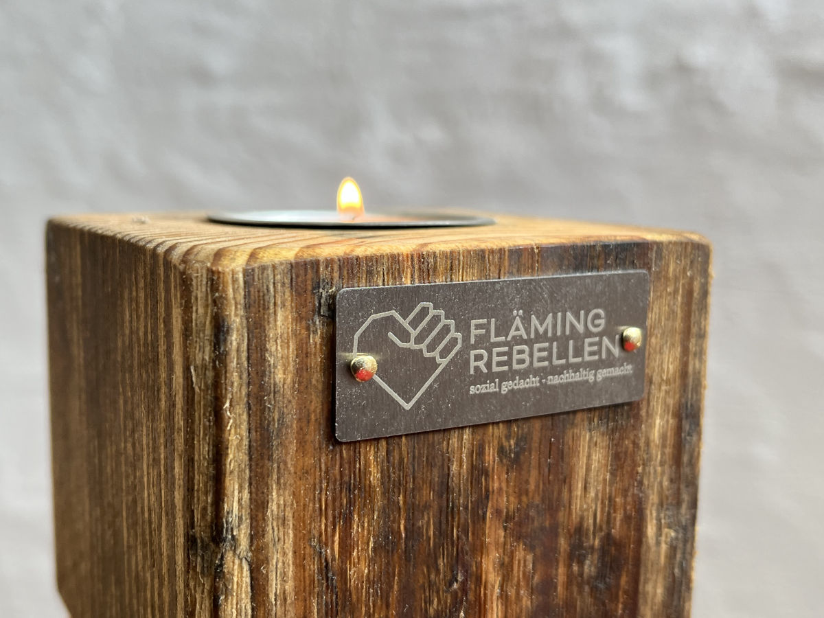 Bringe Wärme und Gemütlichkeit in dein Zuhause mit unserem stilvollen Teelichthalter aus massivem Holz. Jedes Stück wird in liebevoller Handarbeit gefertigt und trägt das charakteristische Flämingrebellen-Logo als edles Metallelement.