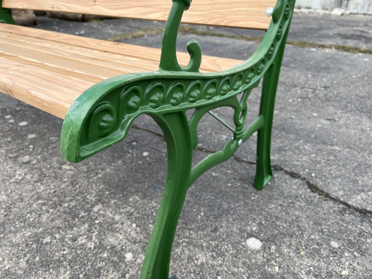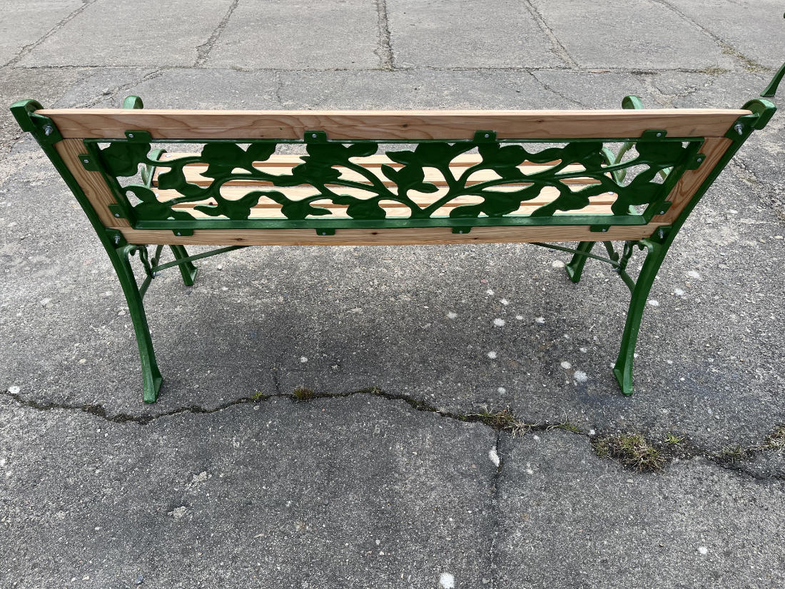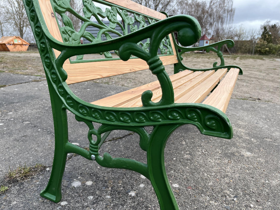 Für die Sitz- und Rückenflächen kamen neue Leisten aus hochwertigem Lärchenholz zum Einsatz – robust, wetterbeständig und mit ihrer warmen Maserung ein natürlicher Kontrast zum grünen Gusseisen.