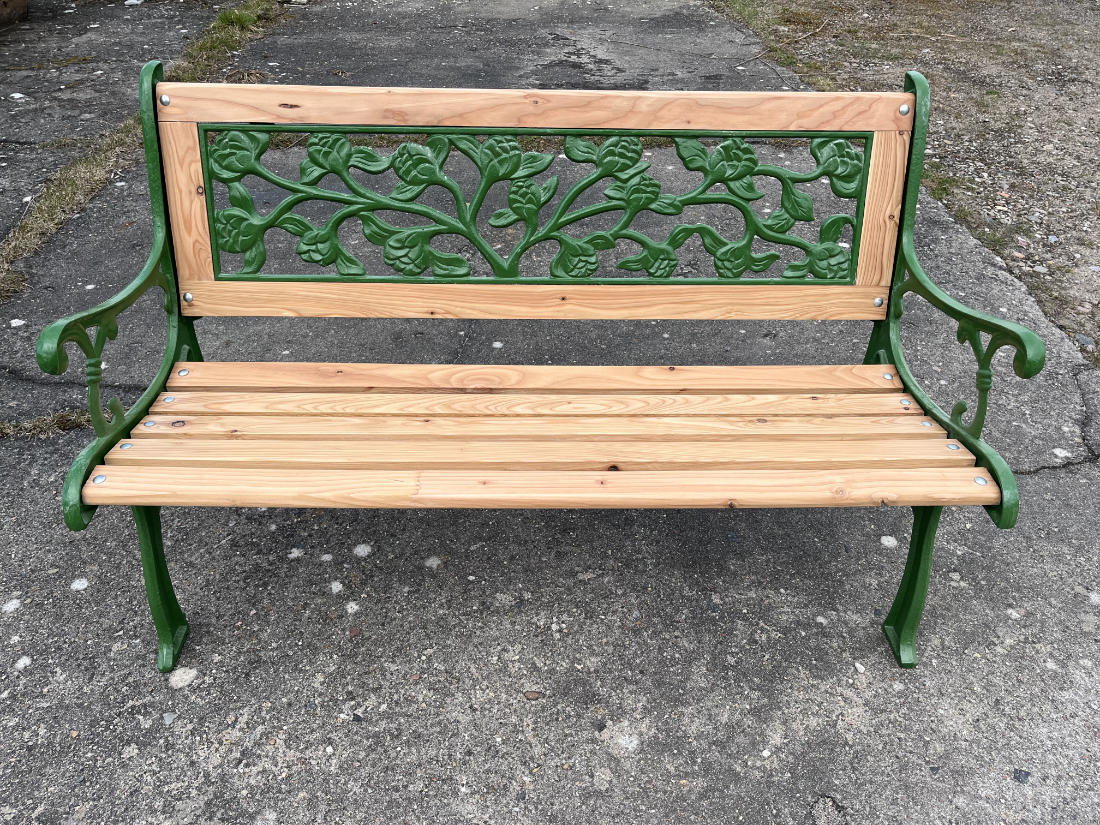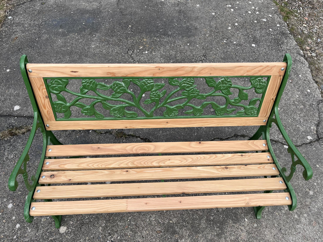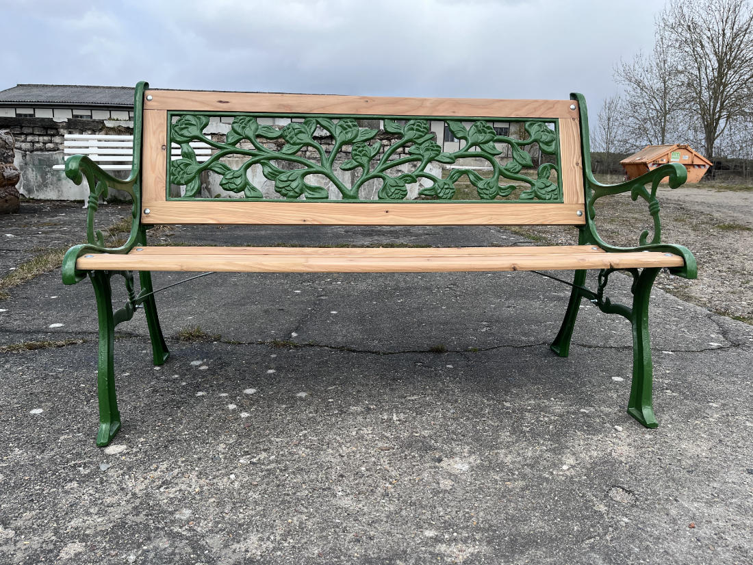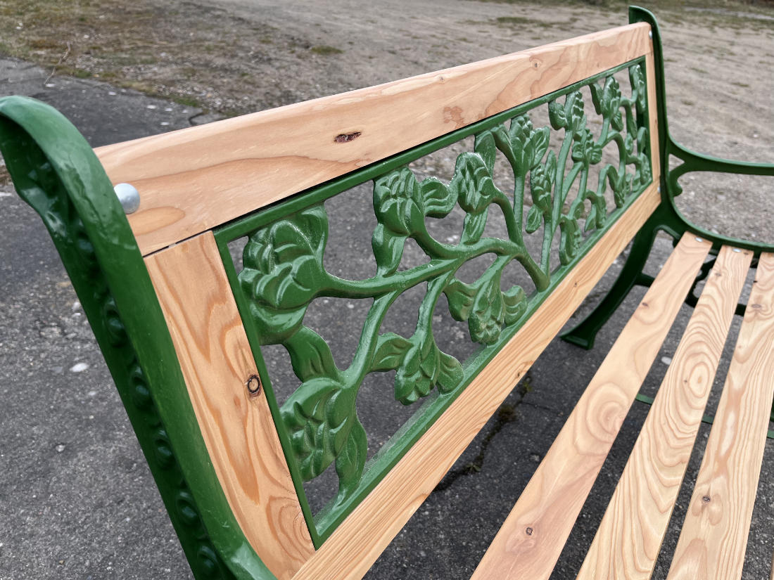 Für die Sitz- und Rückenflächen kamen neue Leisten aus hochwertigem Lärchenholz zum Einsatz – robust, wetterbeständig und mit ihrer warmen Maserung ein natürlicher Kontrast zum grünen Gusseisen.